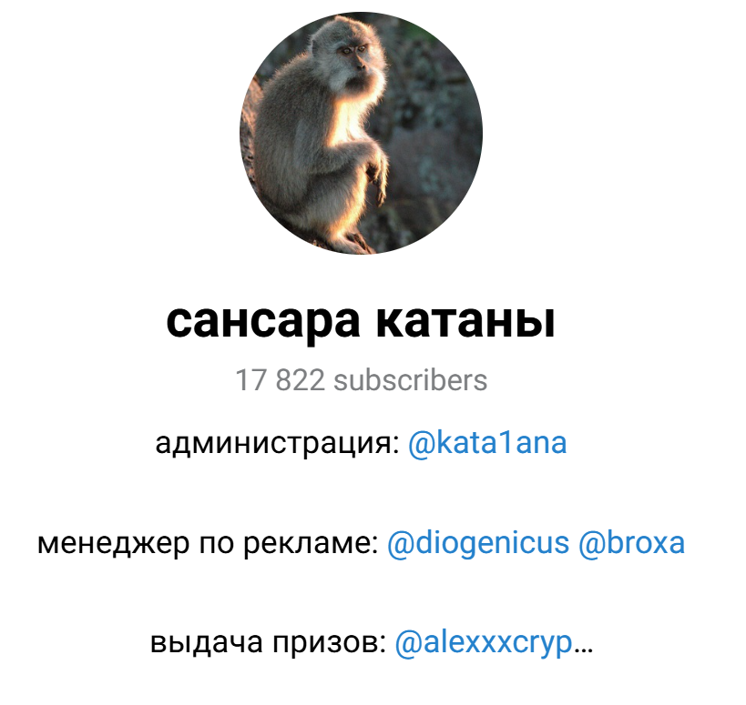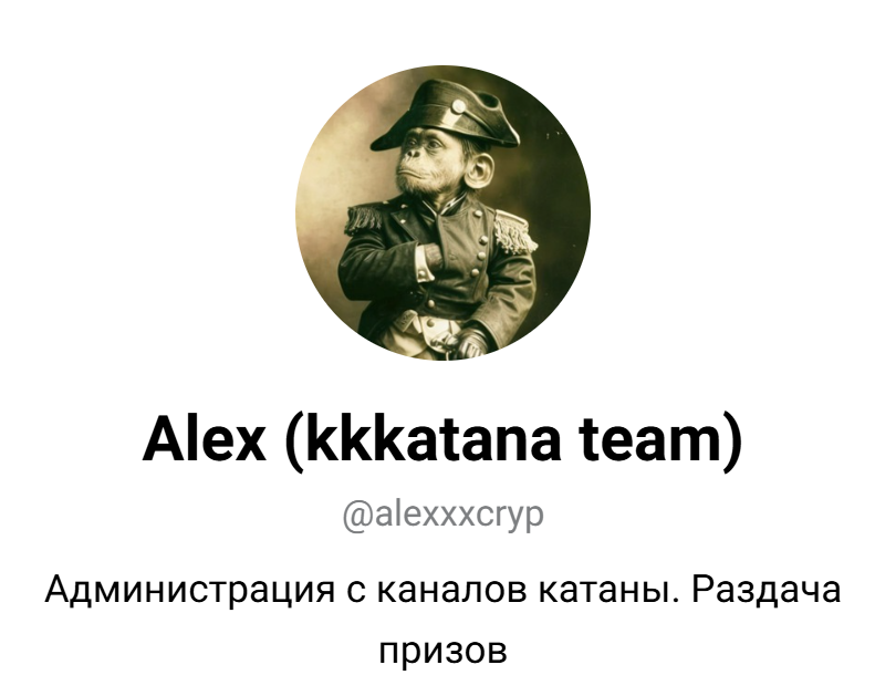 Для обращения к администрации доступна целая группа профилей в ТГ. Один из них — Alex (kkkatana team). Он доступен по ссылке alexxxcryp. В описании говорится, что здесь можно связаться с администрацией каналов и поучаствовать в раздаче призов.