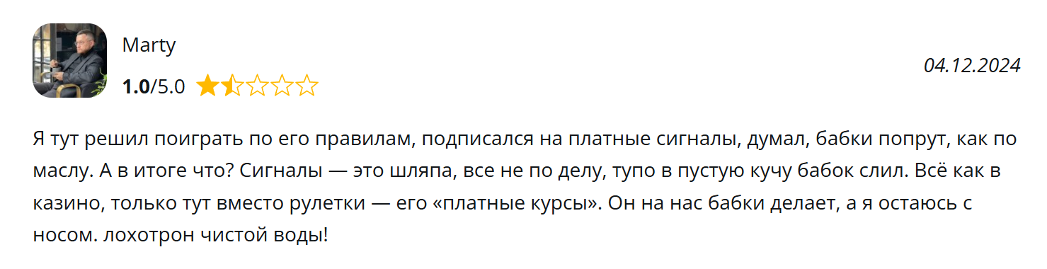 В отзывах о Wade Wilson, Katana и других проектах автора пользователи отмечают анонимность автора. Они говорят о недоверии к сигналам и не рекомендуют ими пользоваться. Многие отмечают, что приведенные рекомендации не приносят дохода.