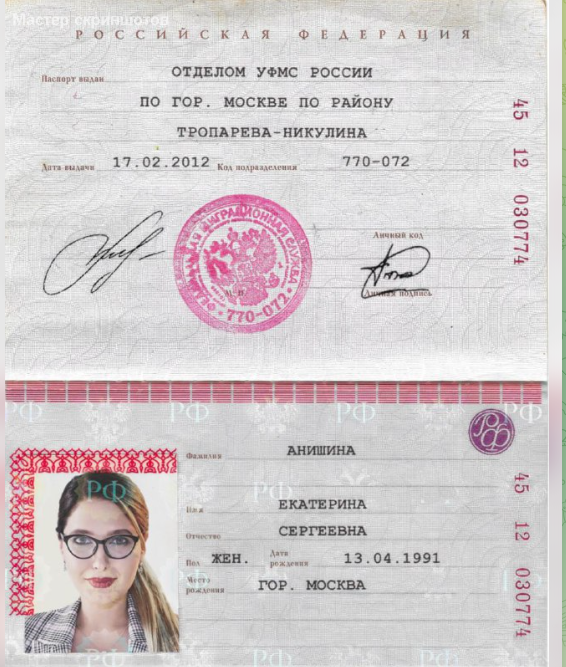 Но документа с такими серией и номером не существует. Также нет такого человека, чтобы у него совпадали дата и место рождения, имя отчество и фамилия. Этот скан – просто фальшивка. А Анишина Екатерина Сергеевна –мошенница.