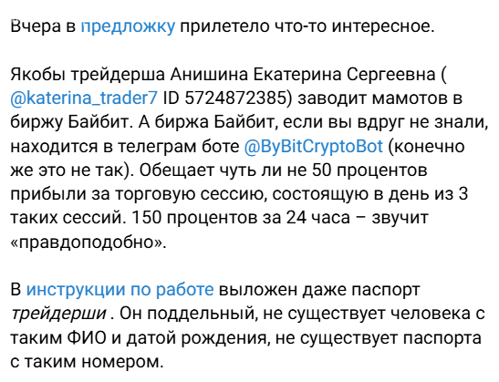 Аналитик через свой ТГ-канал, набирает желающих зарабатывать. Она якобы связана с биржей «Байбит», тем, кто ей напишет, предложит там зарегистрироваться, даст платные сигналы, и поможет на них увеличить депозит в несколько раз. Но торговать она предлагает через @ByBitCryptoBot. Этот бот не имеет к настоящему сервису никакого отношения, а сейчас и вовсе не открывается.
