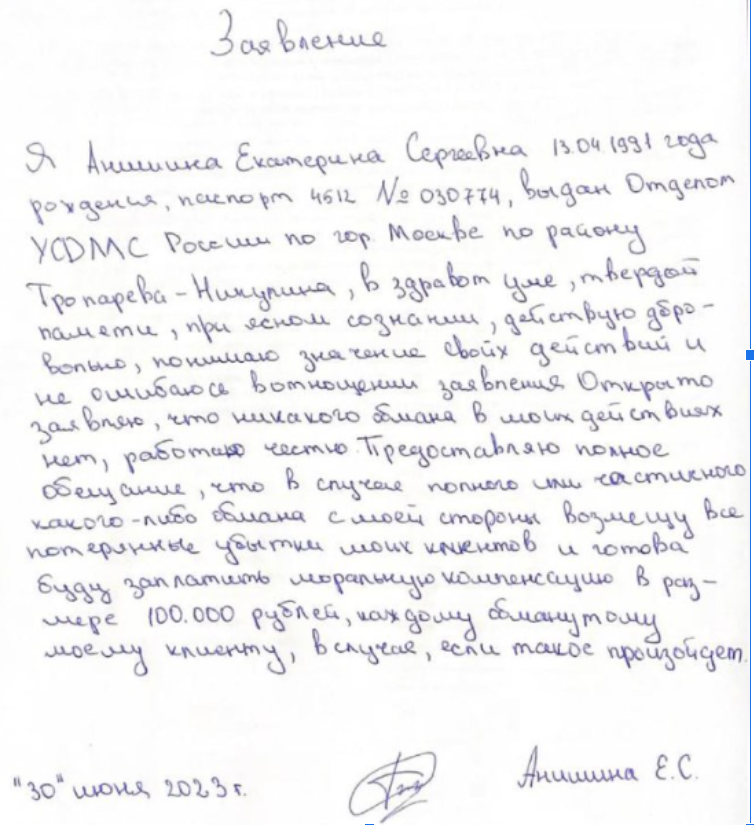 Расписка, в которой девушка заявляет, что не занимается обманом и находится в здравом уме и твердой памяти, не имеет юридической силы. Не стоит верить и в то, что она берет ответственность за риски на себя. Компенсировать убытки, к которым приведут сделки и инвестиции под ее руководством, девушка тоже на самом деле не будет.