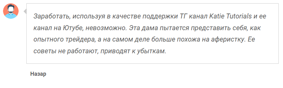 В Телеграмм есть множество каналов, которые скопировали аватарку данного проекта и выдают себя за него, что говорит о высокой популярности трейдера. На них публикуются различные прогнозы, правдоподобность которых оценить довольно сложно. Из этого следует вывод, что канал Katietutorialsofficial довольно популярен, поэтому пользователям следует быть внимательными, чтобы не наткнуться на другие скам-проекты.Отзывы пользователей о трейдере Katie Tutorials