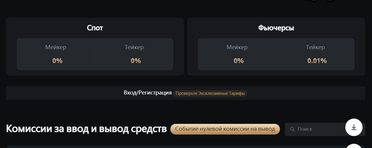 Как говорилось выше, биржа отказалась от большинства комиссий в пользу клиента. На некоторые операции установлены символические комиссионные сборы – 0,01%.