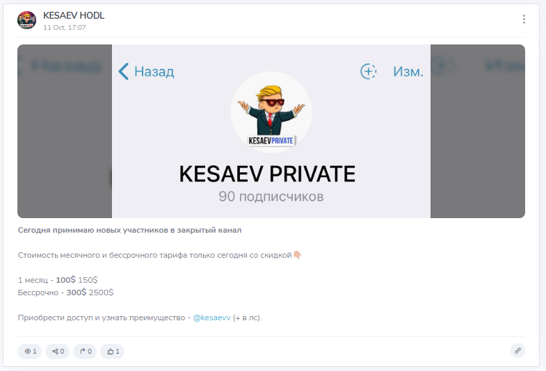 Телеграмм канал Kesaev Hodl был создан в июле 2023 года. На него подписано 14 735 человек, однако это накрутка. Посты читает пара подписчиков, комментарии скрыты, негативные реакции заблокированы. Трейдера зовут Дмитрий Кесаев, о нем нет никакой информации, кроме его стажа в крипте около 7 лет. Однако эти сведения ничем не подкреплены. Своего лица трейдер не показывает, образование и путь развития не описывает. Дмитрий Кесаей публикует рекламу собственных услуг — закрытого клуба, дает 1-2 сигнала в день бесплатно, а также размещает мотивационные посты.