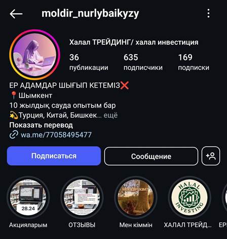 Девушку зовут Молдир. Сейчас у нее два бизнеса, магазин обуви и мусульманской одежды. В процессе управления этим бизнесом она познакомилась с миром Инстаграма, прошла курс трендового таргетолога, курсы видеомейкера и сторимейкера. В настоящее время занимается онлайн-трейдингом, учит торговать с китайскими сайтами и с ресурсами Турции и Европы. Уверяет, что с детства любит торговать. Уже несколько лет в сфере торговли видет рынки Турции, Бишкека, Ташкента и китайские рынки. У нее есть наставничество для тех, кто хочет открыть магазин и торговать в рамках Шаригата.