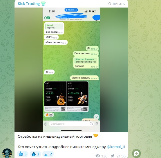 Проверка ТГ-проекта Kick Trading, отзывы трейдеров о заработке на сигналах от Kemal Iii