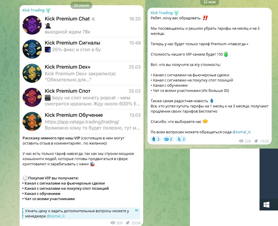 Раньше была возможность выбора одного из трех тарифов — Start (1 месяц), Expert (3 месяца), Premium (навсегда). Но 22 мая появилось сообщение, что остается только Премиум по цене 150$. Часто на канале проводят розыгрыши, где можно выиграть випку.