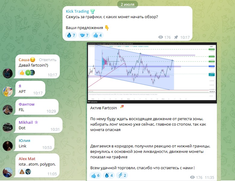 Часто в ленте появляются посты-опросы, где админ спрашивает у аудитории какую монету проанализировать. Он учитывает мнение подписчиков, какой токен наберет больше реакций тот и попадает под разбор.