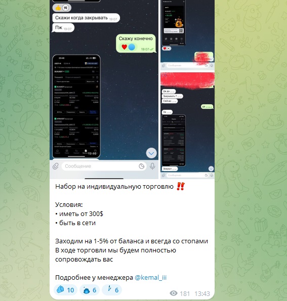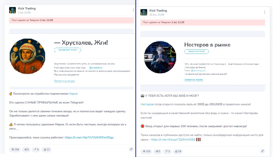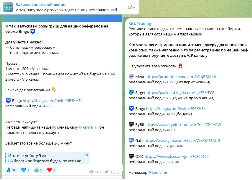 Кроме продвижения торговых платформ-партнеров, на Kick Trading часто размещается реклама других Телеграм-площадок с аналогичным контентом. Якобы это друзья Арслана и Кемала, за подписки обещают всякие бонусы и вознаграждения. Такие посты доступны несколько часов, дальше их удаляют.