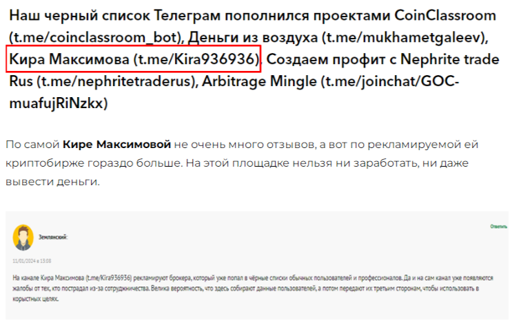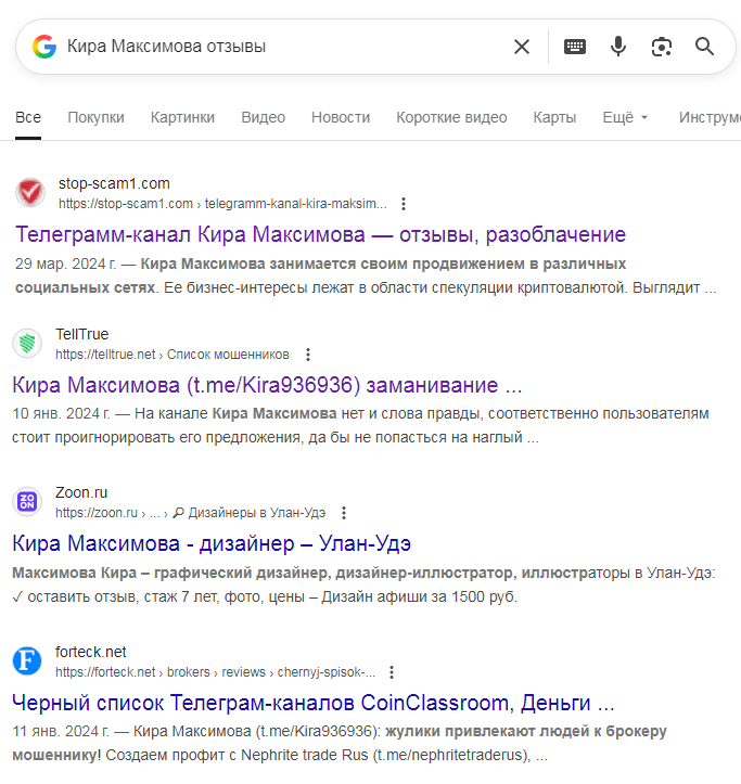На октябрь 2025 года о работе блогера существует всего 3 разоблачения. Причем написаны они были в январе и марте 2024 года. Видимо, в тот период Кира Максимова и вела активную деятельность.