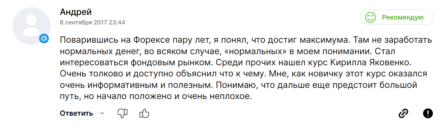 К примеру, некто Андрей после нескольких лет работы на Forex подумал, что достиг пика. Он не смог заработать нормальных средств, и со временем стал интересоваться фондовым рынком. Недавно ему попался курс Кирилла Яковенко. Последний понятным языком пояснял принципы получения заработка на этой сфере. При этом Андрей оказался очень доволен полученной информацией.