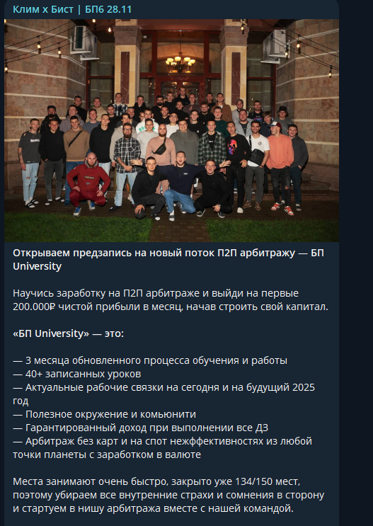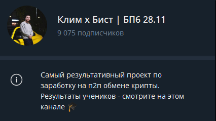 Деятельность проекта осуществляется через телеграм-канал Клим х Бист БП6 28 11, где более 9 тыс. подписчиков. Интересно, что описание ресурса сразу встречает пользователя смелым заявлением о том, что проект является самым результативным в сфере P2P-заработку. Это можно рассматривать лишь как маркетинговую манипуляцию. Очевидно, что есть еще немало достойных обучающих курсов по данной тематике, поэтому непонятно, по каким критериям автор называет свою школу лучшей.
