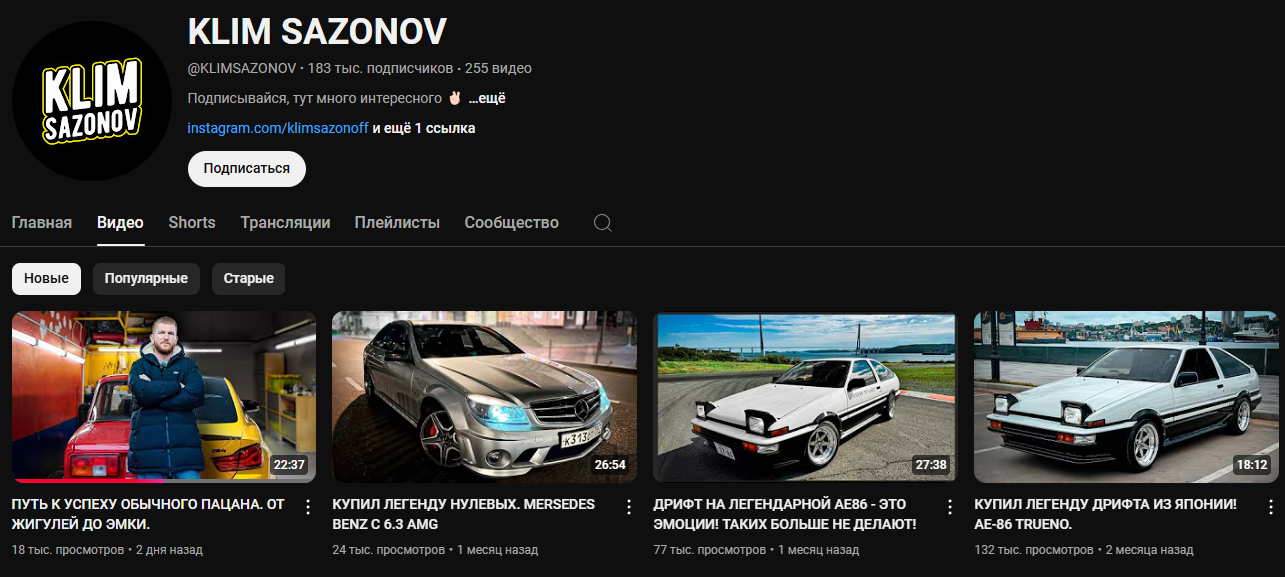 Интересно, что, кроме тг-канала Клим Сазонов x Бист P2P Арбитраж, автор также занимается блогом на YouTube, который посвящен машинам. Причем получается это у него гораздо лучше: количество подписчиков переваливает за 180 тыс., просмотры тоже достигают неплохих показателей. Наличие довольно большой аудитории, пусть и с другими интересами, тоже добавляет трейдеру очков репутации.