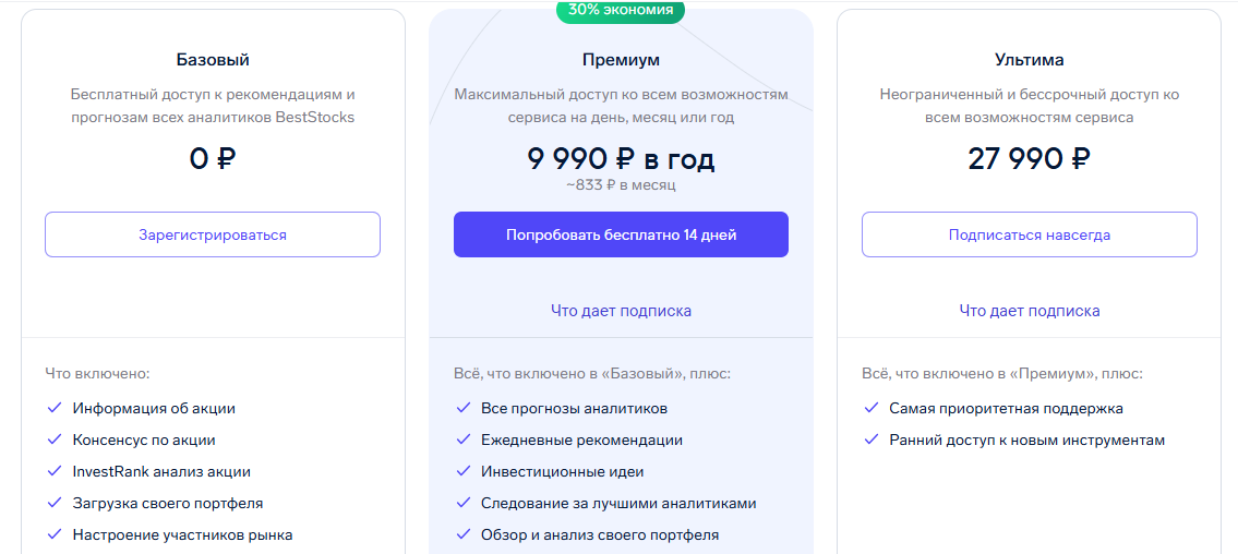 Работа облачной платформы выстроена через три пакета подписки. Базовый пакет (доступен бесплатно) предоставляет smart‑скоры акций, портфельный трекер, доступ к 10 последним новостям и функции сравнения активов. За аналитический функционал и торговые сигналы отвечает Premium‑пакет за 9900 р/год, где добавляются ежедневные идеи, прогнозы, сигналы, обзор личного портфеля и возможность следить за профи. Наконец, Ультима — единовременная оплата около 27990 р с вечным доступом, приоритетной поддержкой и ранним входом в тестовые инструменты.