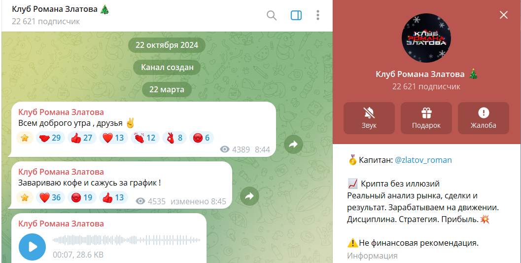 Свою основную деятельность трейдер проводит в мессенджере Telegram, где у него есть собственный канал с немалым количеством подписчиков в конце декабря 2025 года — почти 11 000 человек. Отметим, что ранее аудитория канал была намного больше, однако от Романа многие пользователи отписались. Чтобы понять причину, проанализируем контент ресурса «Клуб Романа Златова».