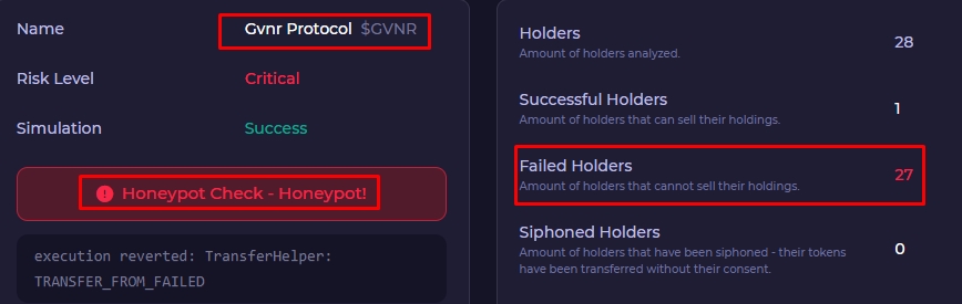 В одной из последних записей основатель проекта продвигает токен $GVNR – в многочисленных постах он расхваливал коин, играл в прорицателя и предвещал ему успех, а также вещал про мощные ценовые импульсы монеты. Также ноунейм сообщает, что токен принадлежит ему. Достаточно проверить адрес контракта на площадке-сканере и мы узнаем, что из 28 владельцев монеты 27 холдеров GVNR не смогли продать свои коины, т.к. купили ханипот.