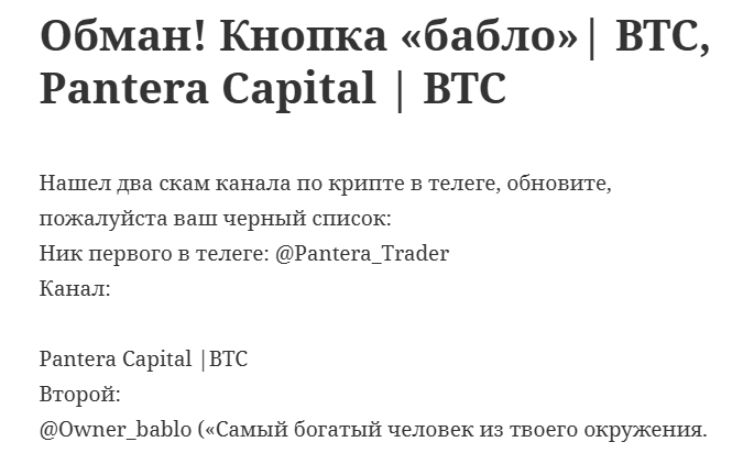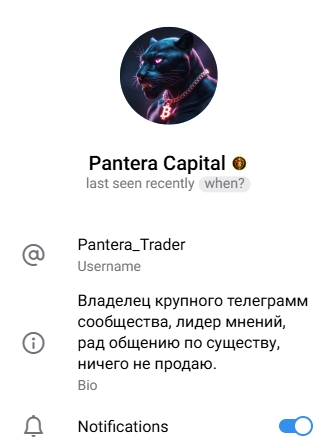 В единственном найденном отклике пользователь сообщает, что у “Владельца” есть и другой аккаунт – Pantera Capital (@ Pantera Trader). Штамповка профилей и сообществ – не новинка в мире финансовых лже-наставников.