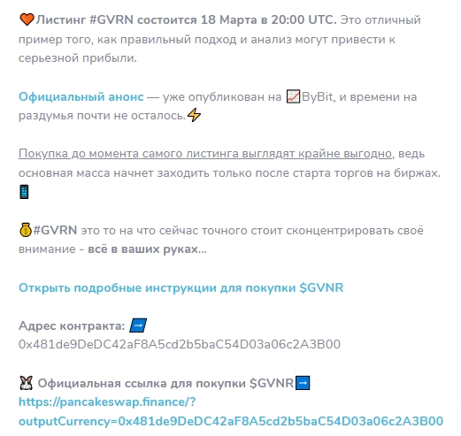 Трейдер никак не подтверждает свою квалификацию и скрывает все данные о себе, нет даже фейковых фото. Некоторое время записи комьюнити были достаточно нейтральными – посвящались новостям крипто рынка, однако затем ноунейм стал активно пиарить токен GVNR, который после проверки оказался honeypot. Канал стремительно теряет своих фолловеров, а маркер Scam предупреждает всех новых подписчиков – сообщество нацелено на воровство денег юзеров.