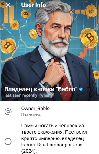 Создатель проекта не сообщает своё настоящее имя – аккаунт называется Владелец Кнопки Бабло (@ Owner Bablo). Очевидно, самыми важными сведениями о себе он считает владение автомобилями и заодно приписывает себе статус очень богатого человека, однако попытка подработать на чьей-то наивности на просторах мессенджера красноречиво говорит о том, что описание профиля – фантазия данного ноунейма.