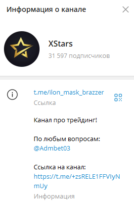 Дополнительно на канале присутствует реклама проектов, обещающих 5000% к прибыли, что звучит не очень реалистично.Ссылка ведет на канал XStars. В качестве администратора указан некий Сергей (Admbet03).