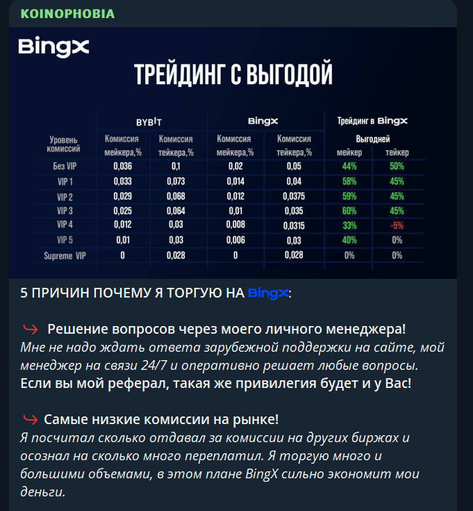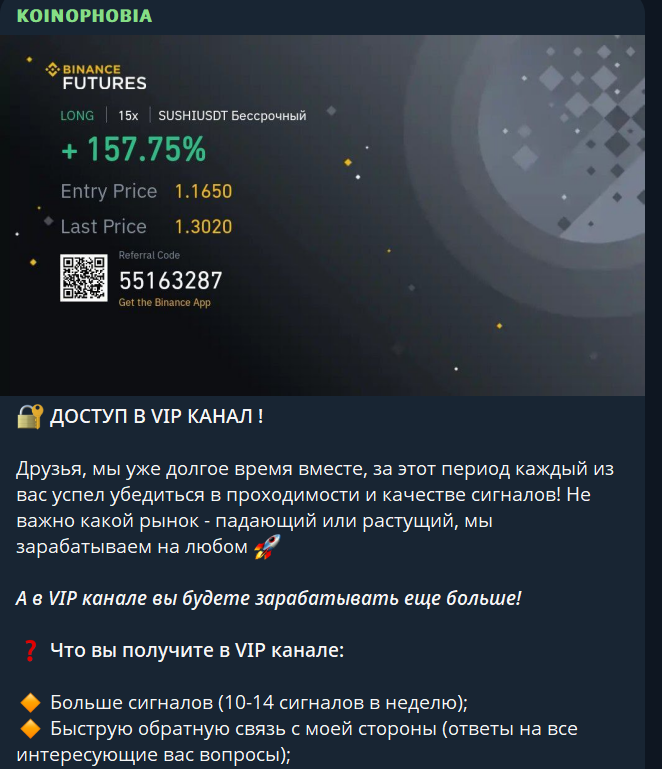 Основная цель, которую преследует Koinophobia adm при ведении своего канала, состоит в привлечении людей в свою VIP-группу. Якобы люди могут убедиться в качестве сигналов в бесплатном канале и получить в закрытом сообществе намного больше. Прежде всего, тут обещаются более крупные заработки. Также стоит рассчитывать на личное общение и помощь со стороны специалистов, около 12 сигналов в неделю и стабильное повышение депозита. Подробности стоит уточнять в личных сообщениях. Стоит отметить, что в таких постах могут быть разные контакты администратора, что говорит о выкупе площадки новыми владельцами.В последнее время трейдер с канала Koinophobia рекламирует биржу BingX и приглашает присоединиться к совместной торговле по реферальной ссылке. Проверка показывает, что четкой линии на канале нет. Многие факторные вызывают сомнения, как связанные со сменой особенностей подачи, так и с меняющимися контактами администрации. Создается впечатление, что одни мошенники перепродают все другим, меняя название.