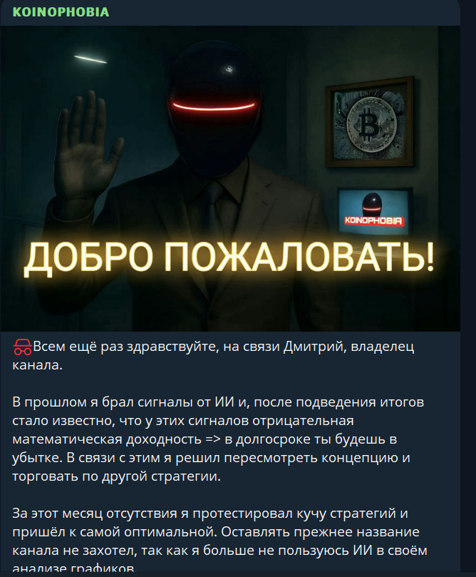 Koinophobia является телеграм-каналом, который ведется опытным трейдером. Он торгует по своей уникальной стратегии, позволяющей зарабатывать стабильно и без больших рисков. После открытия новой стратегии автор обновил свой телеграм-канал и теперь готов поделиться с подписчиками опытом, чтобы вместе работать и достигать больших высот. Мы проведем анализ данного трейдера и его канала, чтобы понять, стоит ли ему доверять и стараться вместе заработать или это очередной развод подписчиков.