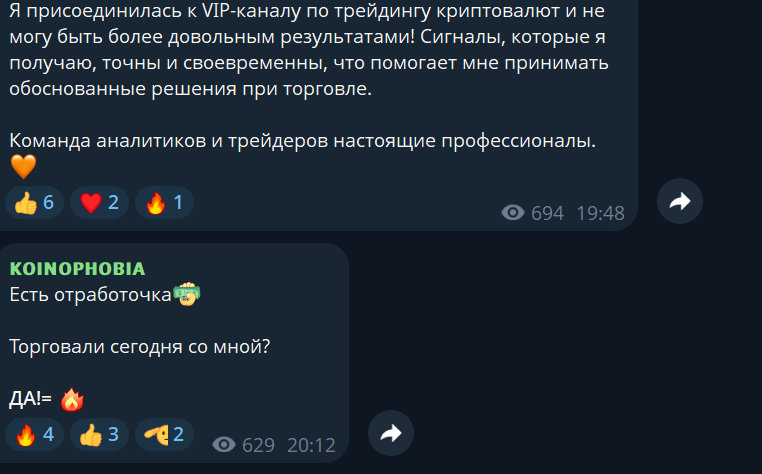 В сети отсутствуют отзывы о телеграм-канале Koinophobia, что еще раз показывает высокую вероятность выкупа канала и смены названия. Отсутствие за несколько лет работы отзывов о канале с коммерческими предложениями и закрытыми чатами выглядит странно. Только в комментариях один и тот же человек пишет восторженные комментарии о деятельности трейдера.