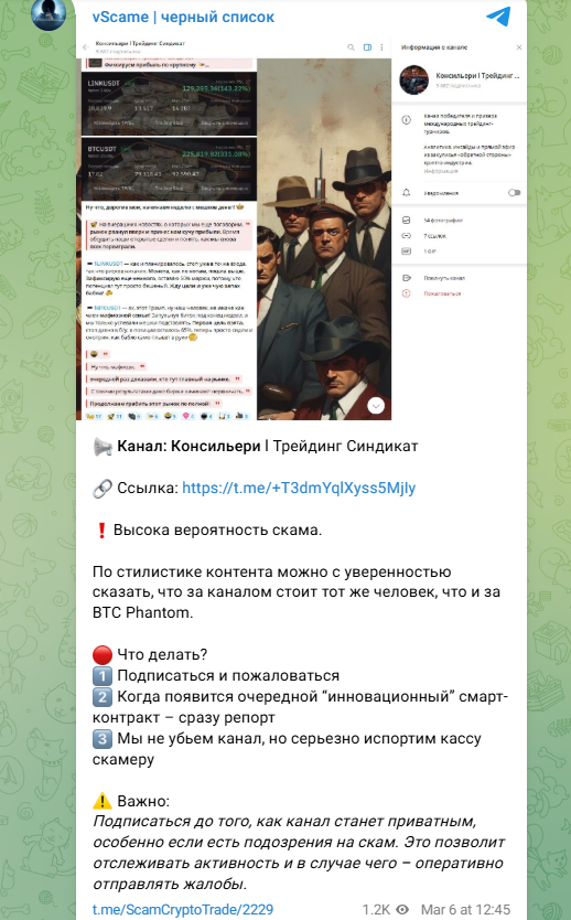 Канал «Консильери Трейдинг синдикат» в «Телеграм» привлек наше внимание потенциальными скам-предложениями в сфере криптовалютного трейдинга. На нем предлагаются инсайды и аналитика, проводятся прямые трансляции. В обзоре мы оценим проект на предмет мошенничества, а также риски рекомендаций и платных услуг.