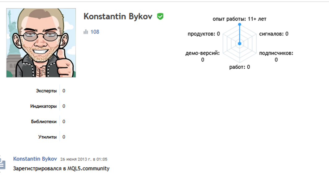О трейдере Быкове практически ничего не известно. Он имеет личный аккаунт в Телеграм @ kostaffey, ведет блог BlogBykova. Также под именем Konstantin Bykov зарегистрирован профиль на платформе MQL.5 Community. Но активности на канале нет, только указан опыт в трейдинге от 11 лет.