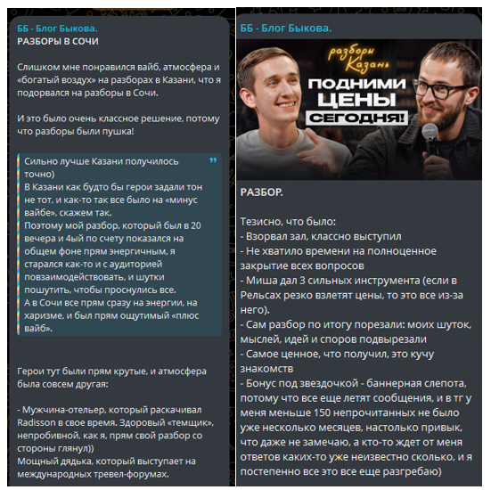 На ТГ канале трейдера Быкова Константина периодически появляются посты с отчетами о проведенных мероприятиях. Особой пользы они не несут, ничего не говорят о роли самого Быкова в проводимых разборах и встречах.