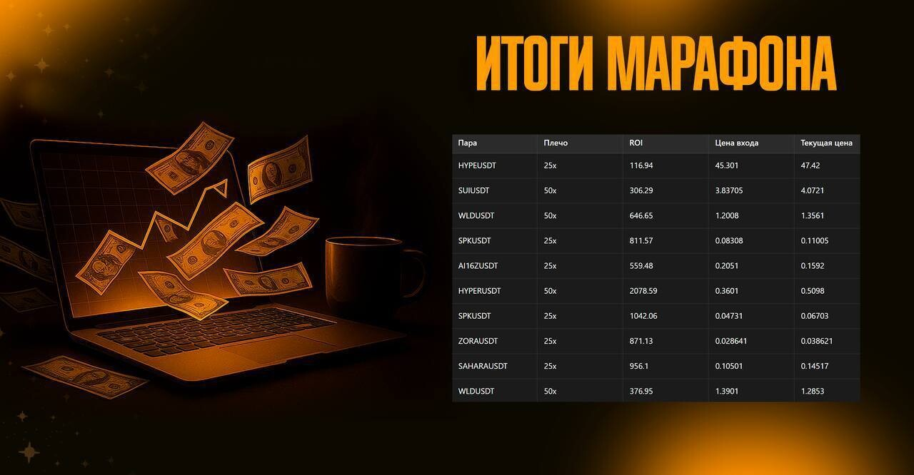 Итоги своих марафонов он выкладывает в виде изображения с таблицей, где отражает точку входа, текущую цену и ROI сделки, однако нигде нет отрицательных результатов, что достаточно странно. Вы должны понимать, что ни один трейдер не может постоянно заходить только в плюсовые сделки, а подобная статистика может говорить о подкрутке результатов.