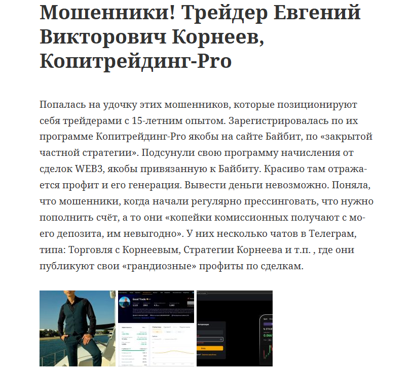 Как таковых отзывов о проекте Копитрейдинг ПРО с Евгением Корнеевым нет, однако на некоторых тематических платформах можно заметить жалобы на мошенничество. По словам людей, Евгений втирается в доверие и вместо обычной ссылки на ByBit продвигают свою WEB3 платформу, где обещает более выгодные условия сотрудничества. Однако после депозита и некоторой торговли, команда трейдера не выводит деньги и запрашивает дополнительные платежи.