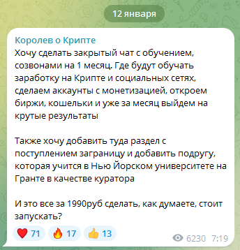 В мессенджере Телеграм не так давно появился канал некоего Романа, который предположительно проживает в Казахстане. Автор утверждает, что у него есть огромный опыт в трейдинге и он может научить любого прибыльно торговать на бирже. Но тогда почему о канале «Королев о крипте» отзывы встречаются только отрицательные? Возможно это обычный мошенник, который продает очередные курсы «ни о чем». Давайте разбираться.