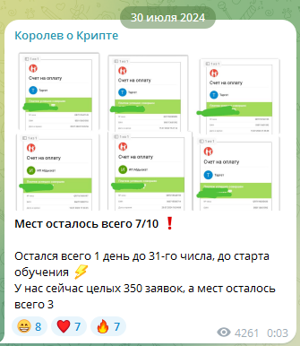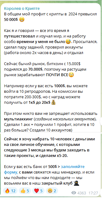 Мошенник пытается убедить читателей, что зарабатывает крупные суммы, и предлагает участвовать в сомнительных схемах — создавать множество аккаунтов-дропов для получения бонусов. Одно из условий для участия — наличие депозита в размере $500.Почему нельзя доверять Роману Королеву