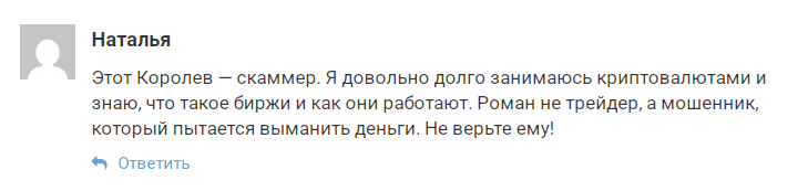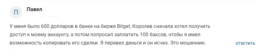 У сообщества Korolev o Kripte мало реальных отзывов — вероятно, аферист либо не пользуется популярностью, либо только раскручивает свой канал. При этом немногие найденные комментарии носят отрицательный характер. Трейдер по имени Павел написал, что перевел Роману $100 за копитрейдинг, после чего тот исчез с деньгами.