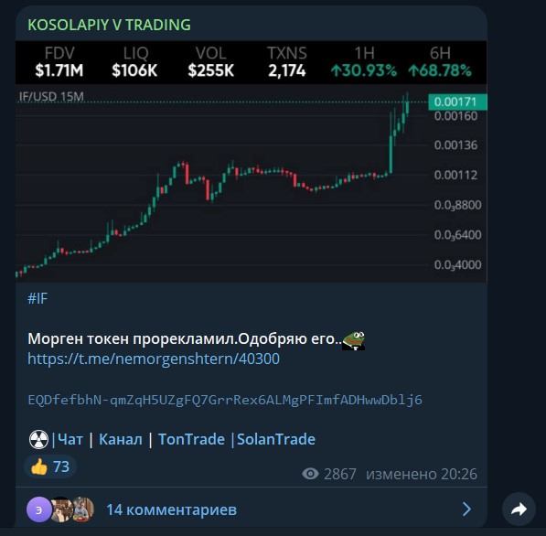 На канале трейдер публикует новые проекты, вышедшие на TON и Solana, рассказывает, во что вложился сам, выявляет скамные токены, публикует новости обоих блокчейнов. Торговые сигналы не дает.