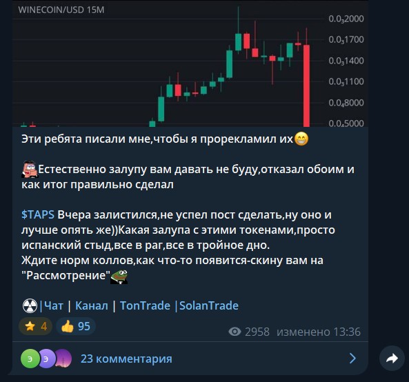 Канал появился в мае 2024 года, за его созданием стоит анонимный трейдер. Судя по контенту, он специализируется на инвестициях в токены на базе сетей TON и Solana. Ведет канал в формате дневника, делится мыслями и информацией по сделкам. Неизвестен его реальный опыт в работе с криптой.