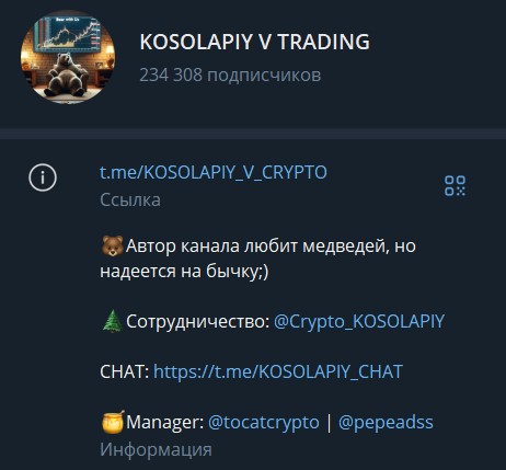 На канал подписаны аж 234 000 человек, при этом посты просматривает около 1% пользователей: аудиторию могли накрутить ботами. Трейдер не показывает лицо, неизвестно, как его на самом деле зовут. Работает под ником Crypto KOSOLAPIY. Кроме канала есть чат KOSOLAPIY CHAT (BEAR DEN CHAT), работают над ними админы tocatcrypto и pepeadss.