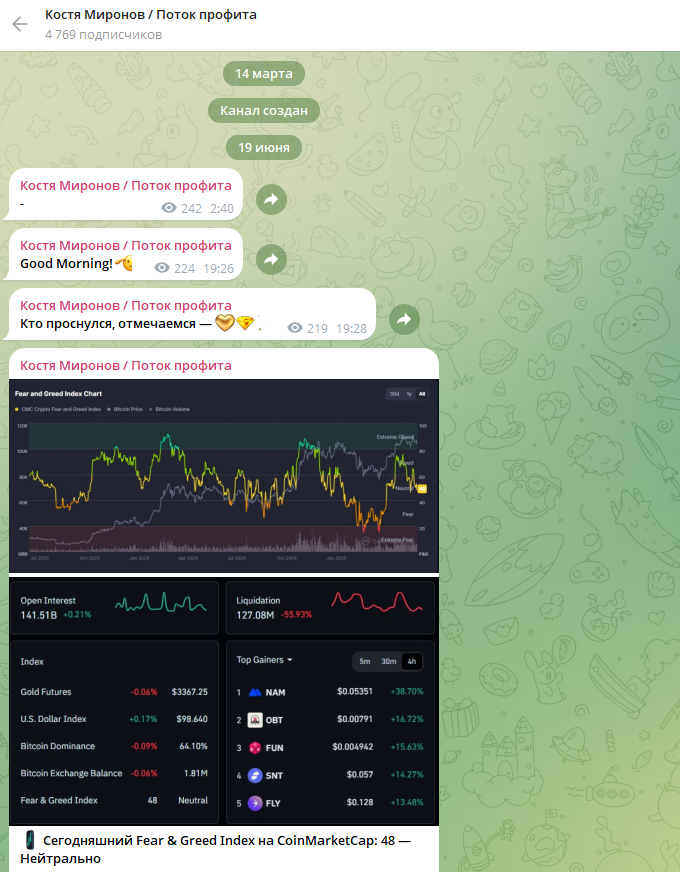 Костя Миронов показывает на канале свои инвестиционные сделки, разбирает показатели и возможные тенденции рынка. Он частично демонстрирует свой метод анализа, но не дает подробностей о системе, призывая пользователей следить за его действиями.Автор предлагает покупать и продавать криптовалюту, следуя его сигналам, и обещает обеспечить возможность заработать. О самом проекте складывается негативное впечатление, поскольку Костя не предоставляет реальных подтверждений своего дохода.