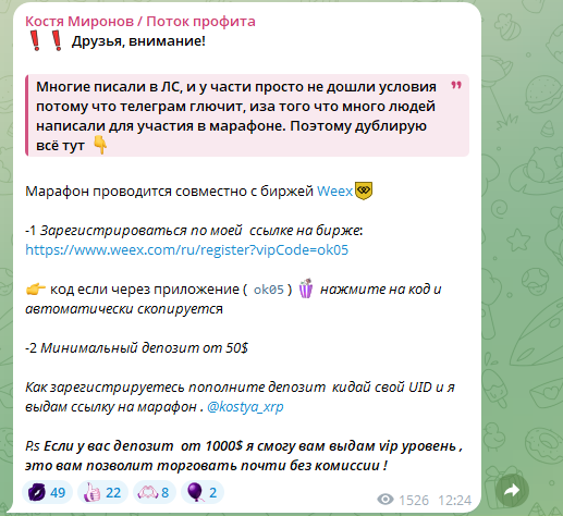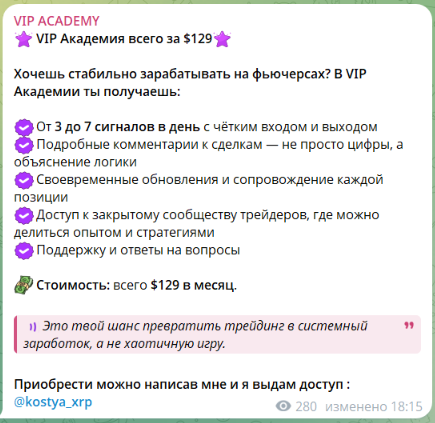 Дополнительно Костя получает прибыль, предлагая записаться на свои курсы в Vip-академии. В рамках программы он обещает публиковать до 7 сигналов в день, комментировать сделки и своевременно обновлять позиции.