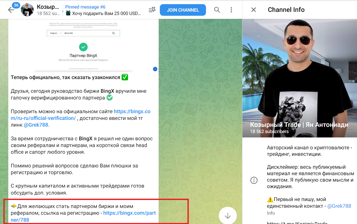 Трейдер Grek также проводит конкурсы с призовым пулом в 1 500 долларов, который получат 15 пользователей. Условием участия является подписка на различные трейдерские каналы. Плюс, Ян предлагает 25 тыс. USDT рефералам. На сегодняшний день остальные услуги не продвигаются.