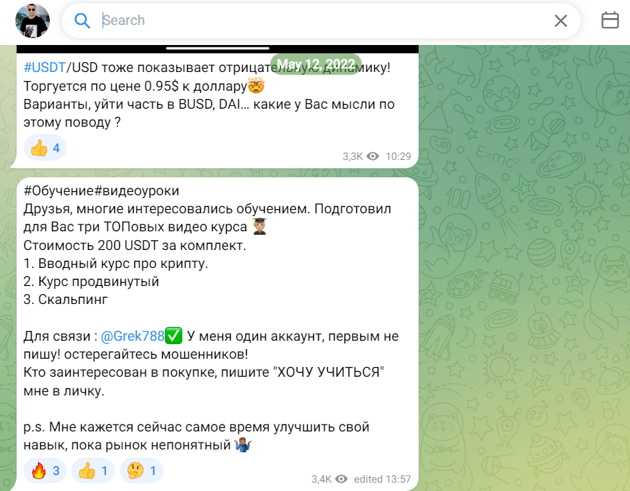 Основатель канала Козырный Trade предоставляет обучение по торговле цифровыми валютами и скальпингу. Что конкретно будет входить в курс, неизвестно, так как детальное описание и сайт отсутствуют. Однако указано, что доступ обойдется в 200 долларов, и по вопросам нужно обращаться к админу в лс.
