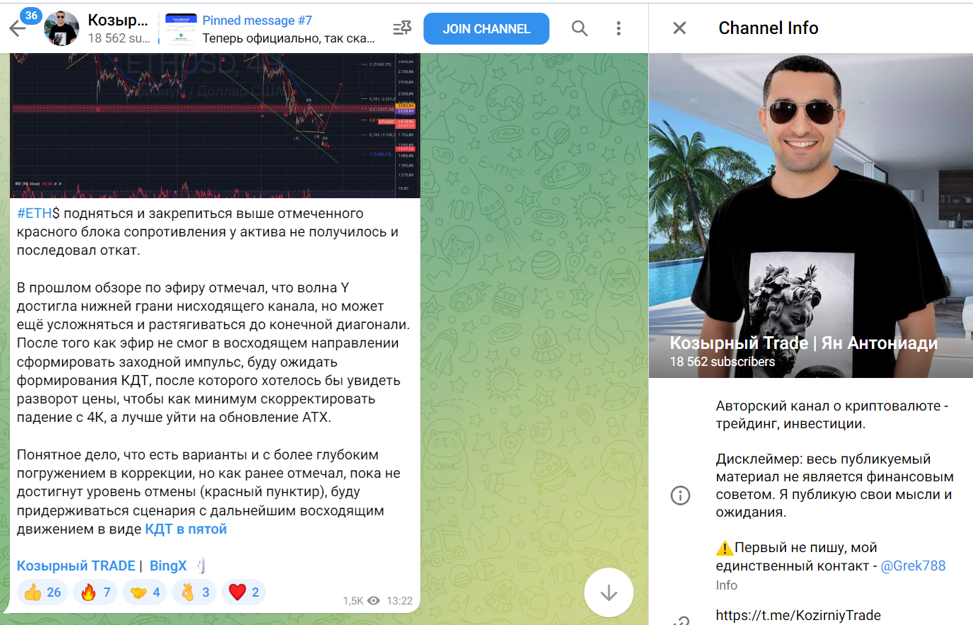В паблике KozirniyTrade можно увидеть посты с новостями в сфере крипты и блокчейна. Админ уведомляет о мероприятиях и различных конференциях. Кроме того, основатель предупреждает аудиторию о мошенниках, которые работают от его имени и предлагают сомнительные услуги. Создатель канала делится общедоступными сигналами по торговле, проводит краткую аналитику рынка. Еще рекомендует приобретать определенные монеты и отказаться от покупки других. Иногда оставляет голосовые сообщения с разборами ситуаций. Тем не менее предупреждает, что к его советам нужно подходить с осторожностью.
