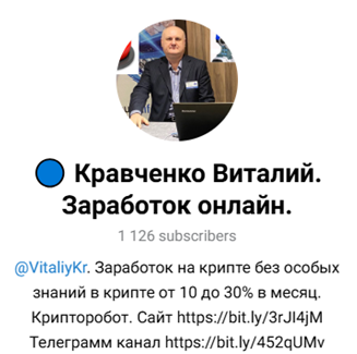 В Телеграме Виталий Кравченко о криптовалюте рассказывает на канале «Заработок онлайн». На него подписано 1200 пользователей, создан канал в 2022 году, комментарии закрыты.