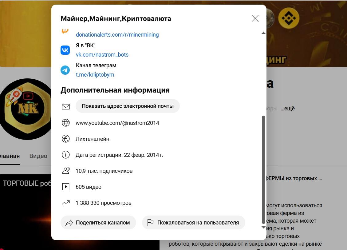Больше всего подписчиков у Алексея на Ютубе @nastrom2014 – их там более 10 тыс. человек. Старые ролики набрали тысячи просмотров, а у новых популярность низкая. В видео показано использование торговых ботов и полученная с них прибыль.