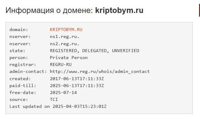 У трейдера также есть личный сайт kriptobym.ru, который создан в 2017 году. Эти данные есть на сервисе whois.ru.