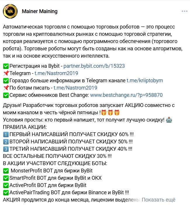 Трейдер предлагает только одну платную услугу – покупку ботов у Mainer19844. Цена нигде не указана, но во ВКонтакте есть пост со скидками до 30%. Также Алексей зарабатывает на рефералах, так как во многих публикациях есть партнерские ссылки на известные проекты. Например, биржу Bybit. В Ютубе есть ссылка на донат, автор просит пожертвования от 5 евро.