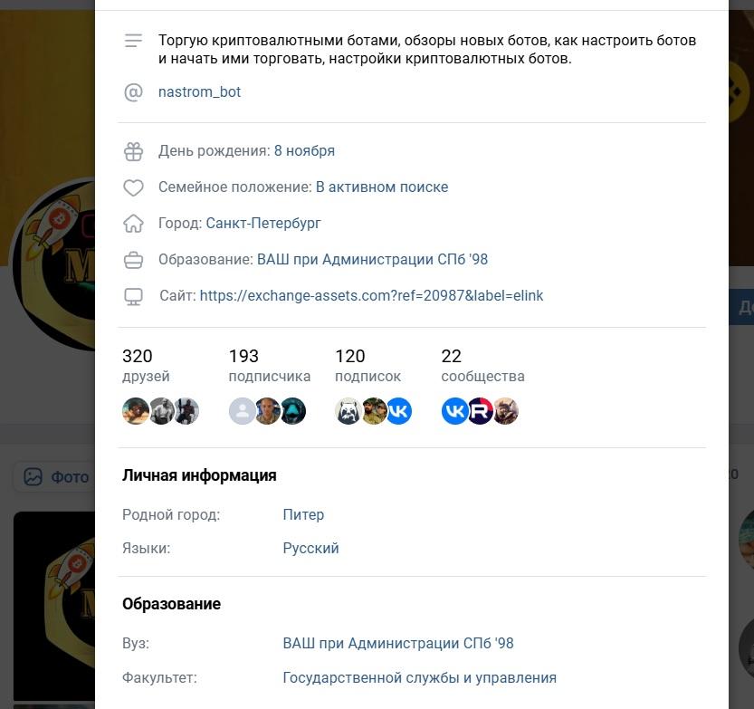 В Телеграме аудитория небольшая, менее 800 подписчиков. Посты выходят несколько раз в день, но редко набирают более 70 просмотров и 6 реакций. У трейдера также есть профиль во ВКонтакте nastrom_bots, который называется Mainer Maining, где у него 320 друзей. Здесь написано, что автор окончил ВУЗ «ВАШ при Администрации СПб» на факультете «Государственной службы и управления». Комментарии везде отключены.
