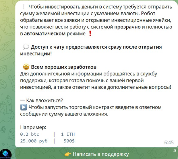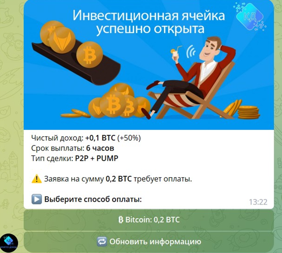 Схема обмана на «Крипто доход» довольно распространенная на просторах Телеграма. Доверчивые инвесторы оплачивают услугу и через обещанные 6 часов им приходит уведомление, что торговая сессия успешно завершена. Вот только вывести прибыль не так-то просто. Возникает необходимость уплаты налогов, совершения встречных платежей и прочих выплат.
