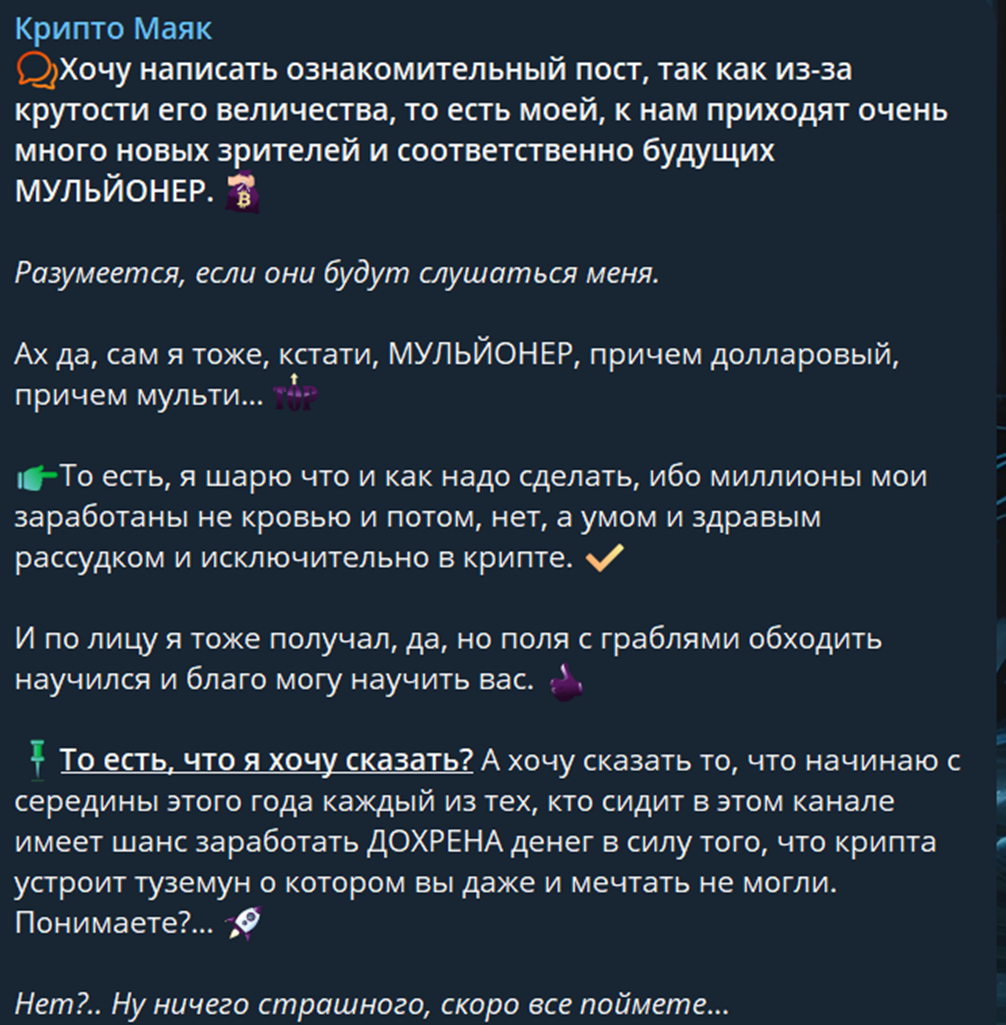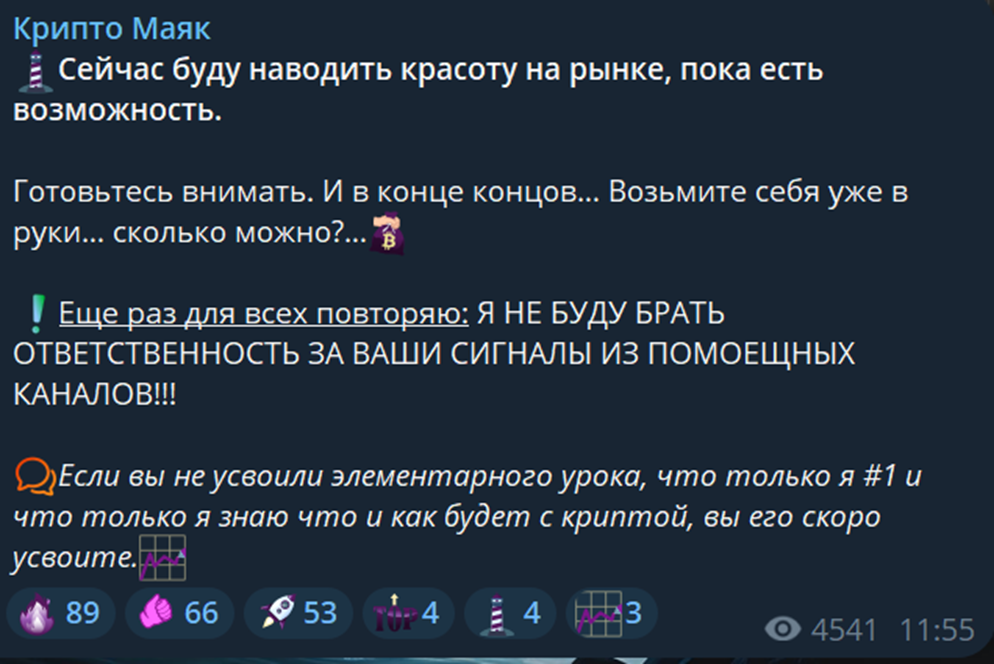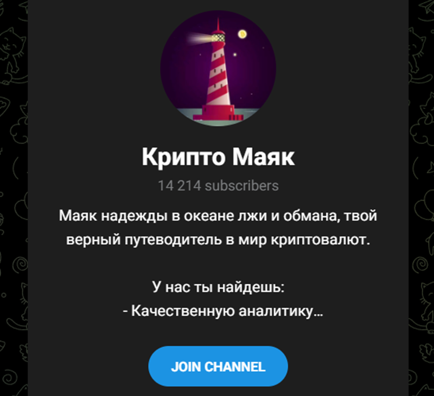 В своем телеграм-канале трейдер предлагает присоединиться к нему для заработка на криптовалюте. В описании указано, что это маяк надежды среди множества площадок, которые промышляют обманом. Он же может стать путеводителем в сфере крипты и дает посетителям качественный анализ рынка, обучающие материалы, авторские статьи. Также трейдер Крипто Маяк отдельно выделяет в качестве преимущества отсутствие рекламы.